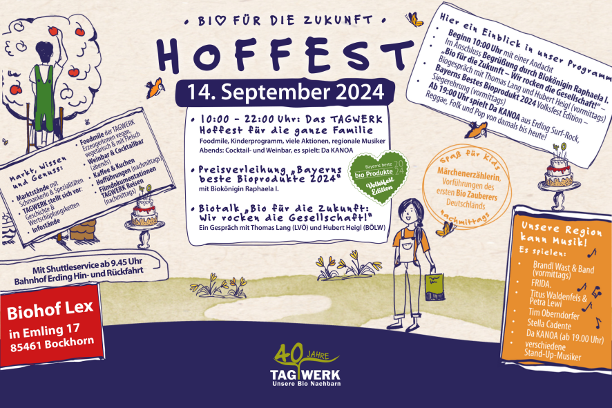 mit dabei: Biokönigin Raphaela I. - Podiumsgespräch "Bio für die Zukunft - Wir rocken die Gesellschaft!" mit Thomas Lang (LVÖ) und Hubert Heigl (Naturland) - Bayerns Bestes Bioprodukt 2024 – Siegerehrung - Musik, Musik, Musik, Hofbesichtigung, großes Genussprogramm, Kinderspiel