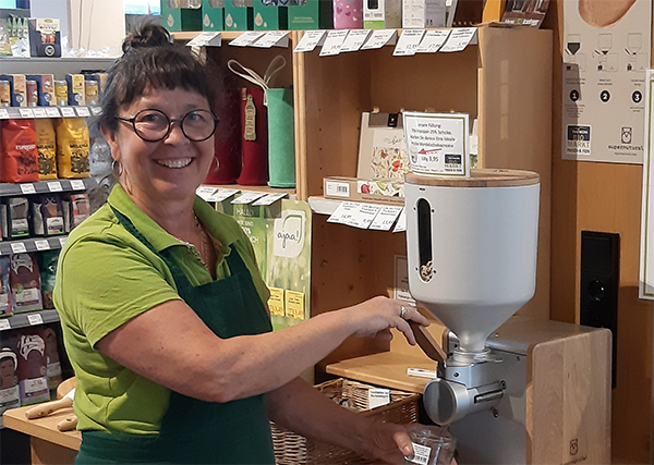 Hier füllt Sabina frisch gemuste Mandel-Schoko-Creme ins Frisch & Fein - Pfandglas. Super lecker und fluffig! Ausschließlich geröstete Mandeln und Vollmilch-Schokodrops. Ohne Zucker, Emulgatoren oder irgendetwas anderes.