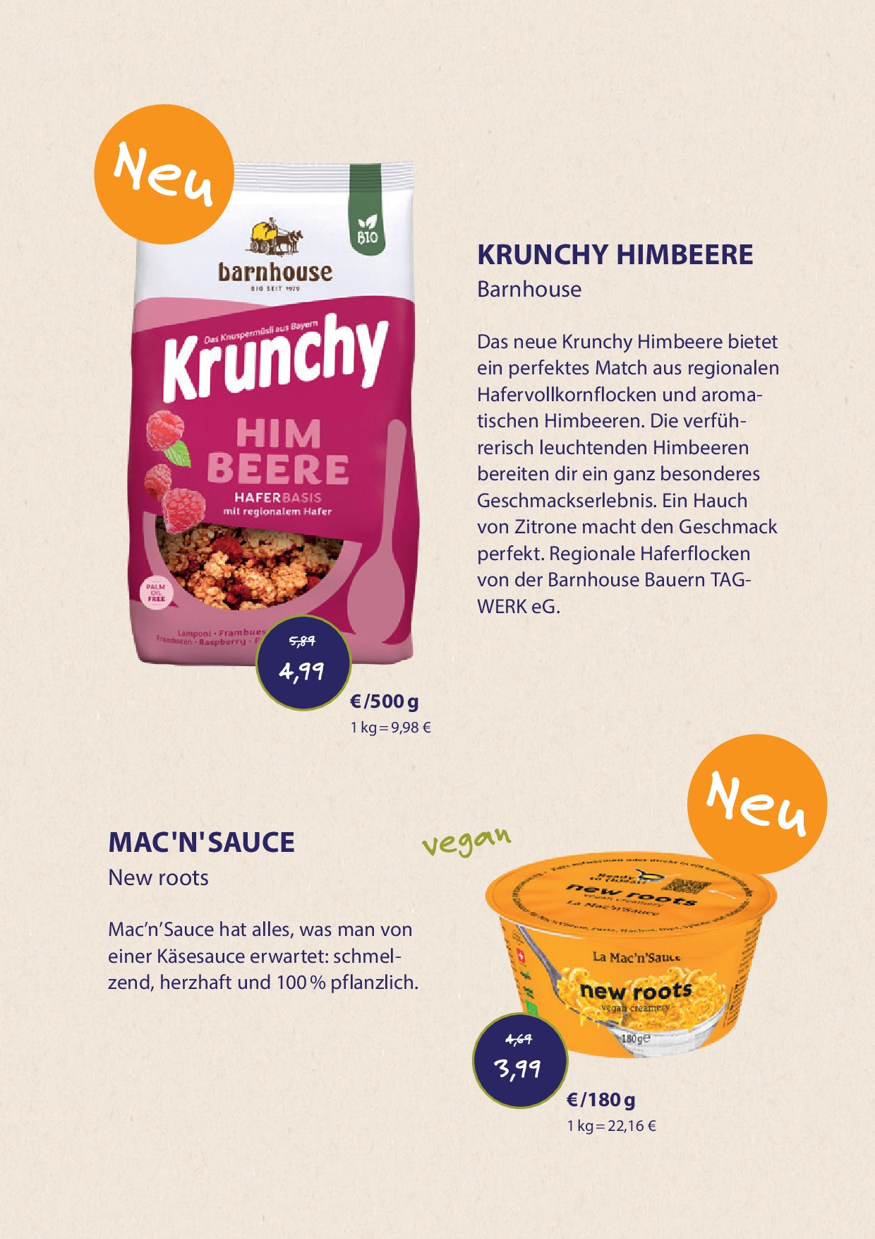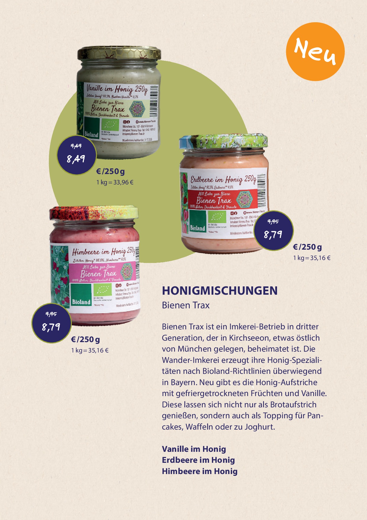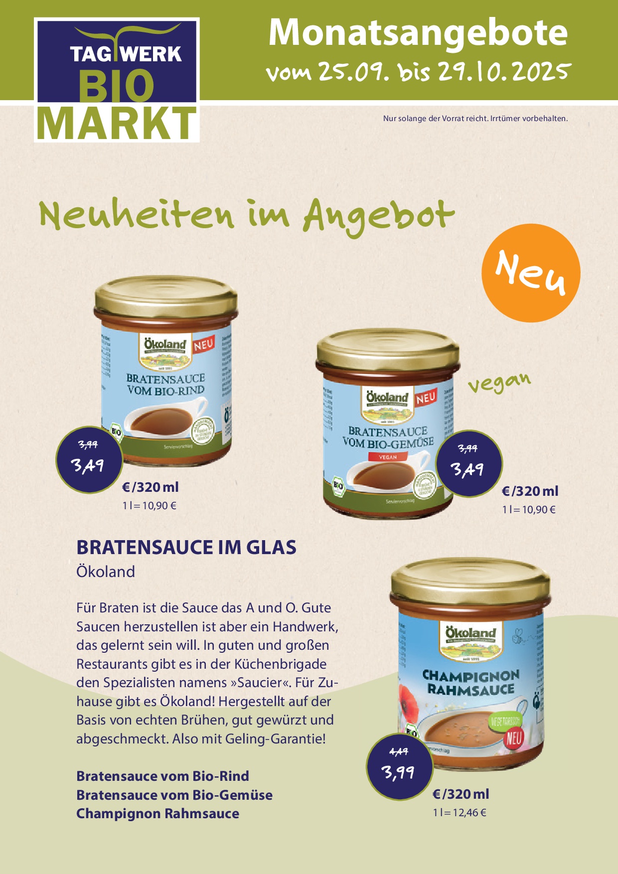 Das Motto des Monats: Goldener Oktober. Nachdem die Getreideernte eher mau ausgefallen ist, haben unsere Bauern bei den Feldfrüchten eine reiche Ernte eingefahren. Und damit gibt es reichlich frische Angebote der Woche. Auch die Neuprodukte sind reichlich wie selten. Die Fachmesse BioSüd in Augsburg lässt grüßen und unsere Hersteller waren alle kreativ. Bratensoßen, viele neue vegane Alternativen wie Obazda, die sich schmecken lassen können. Die Wanderimkerei Trax, südlich von München, liefert Honig-Frucht-Mischungen, ein wunderbares Topping für Waffeln und Pancakes. Aus fluffig weichem Briocheteig haben wir jetzt tolle Burger Buns. Neue Nussdrinks von Allos, ein Low Sugar Choko Crunchy von Barnhouse und vieles mehr. Lassen Sie sich überraschen.