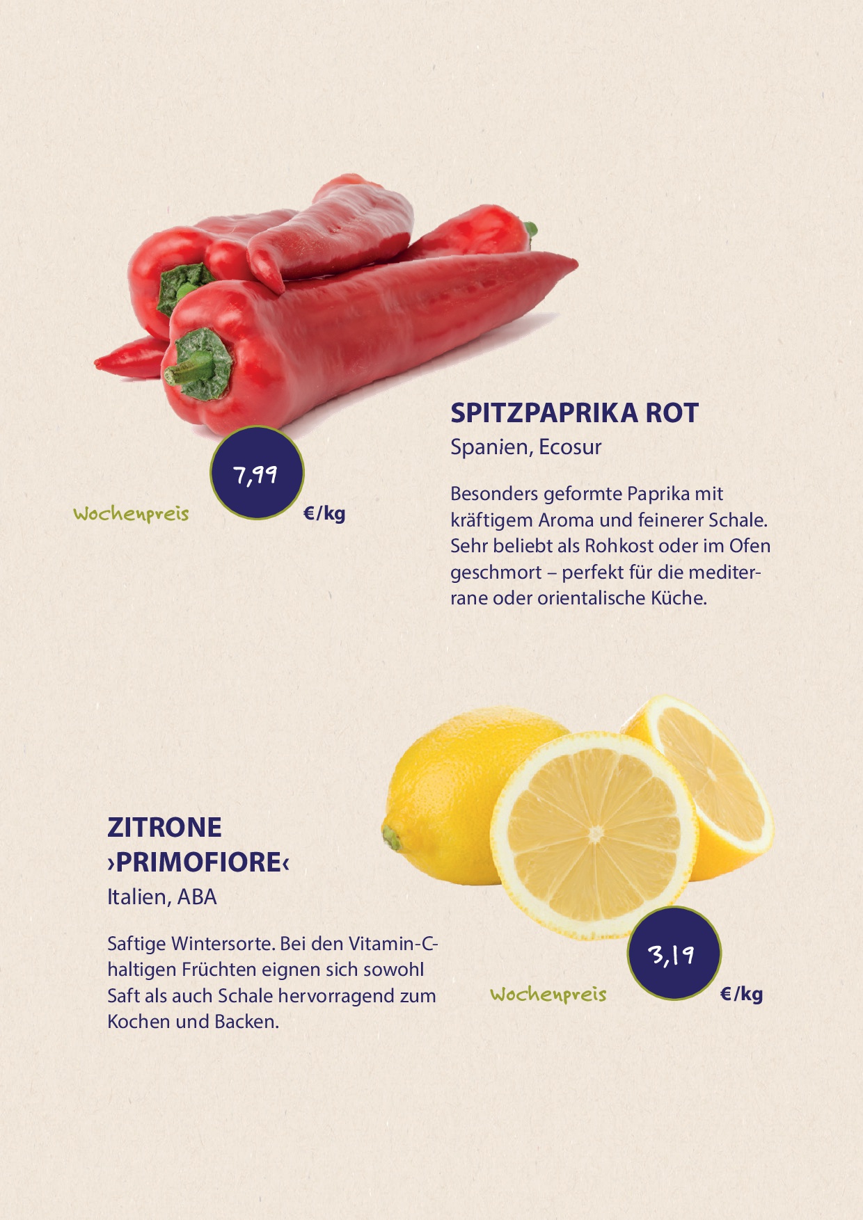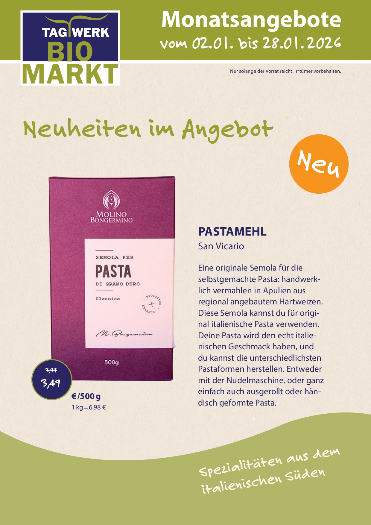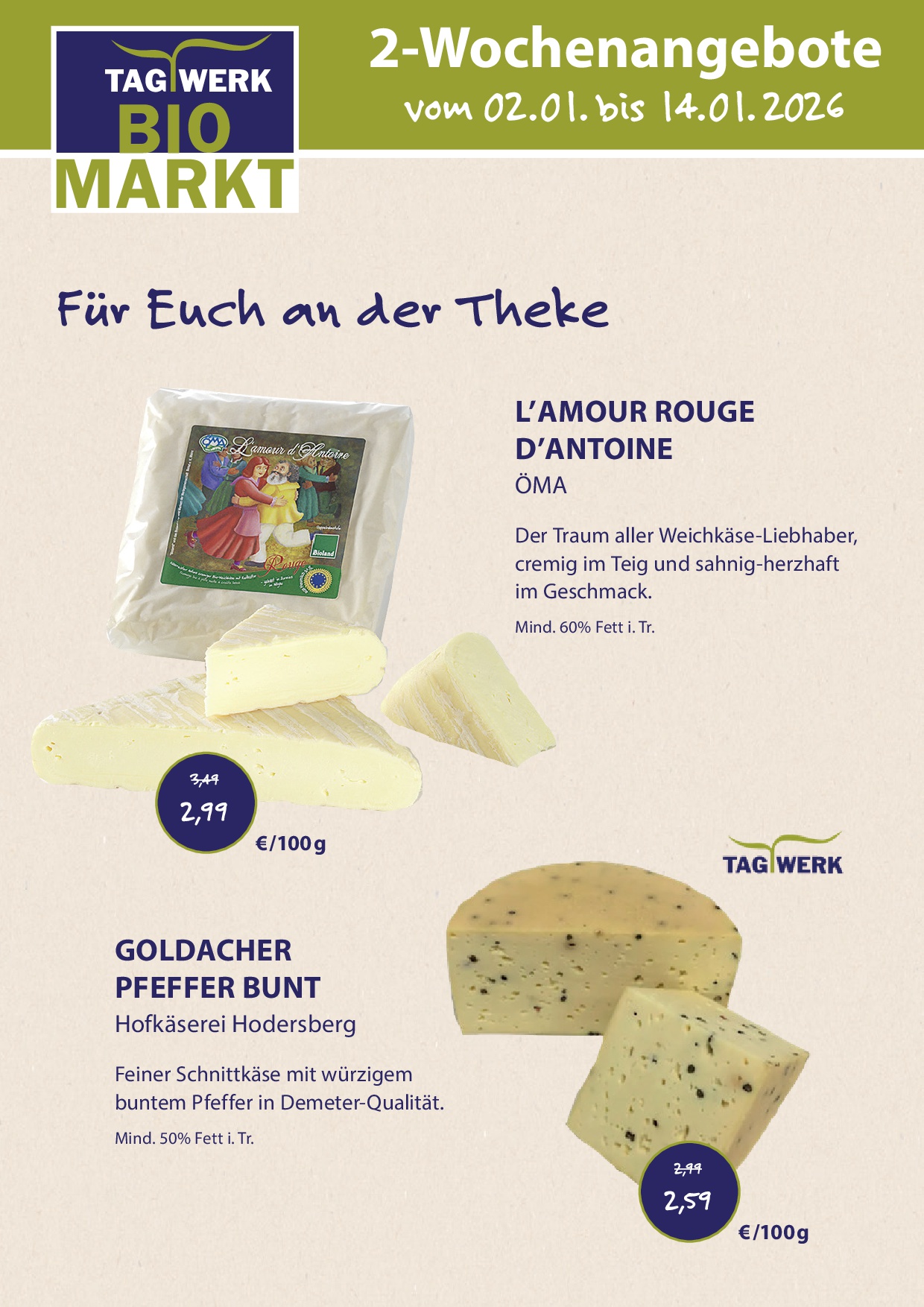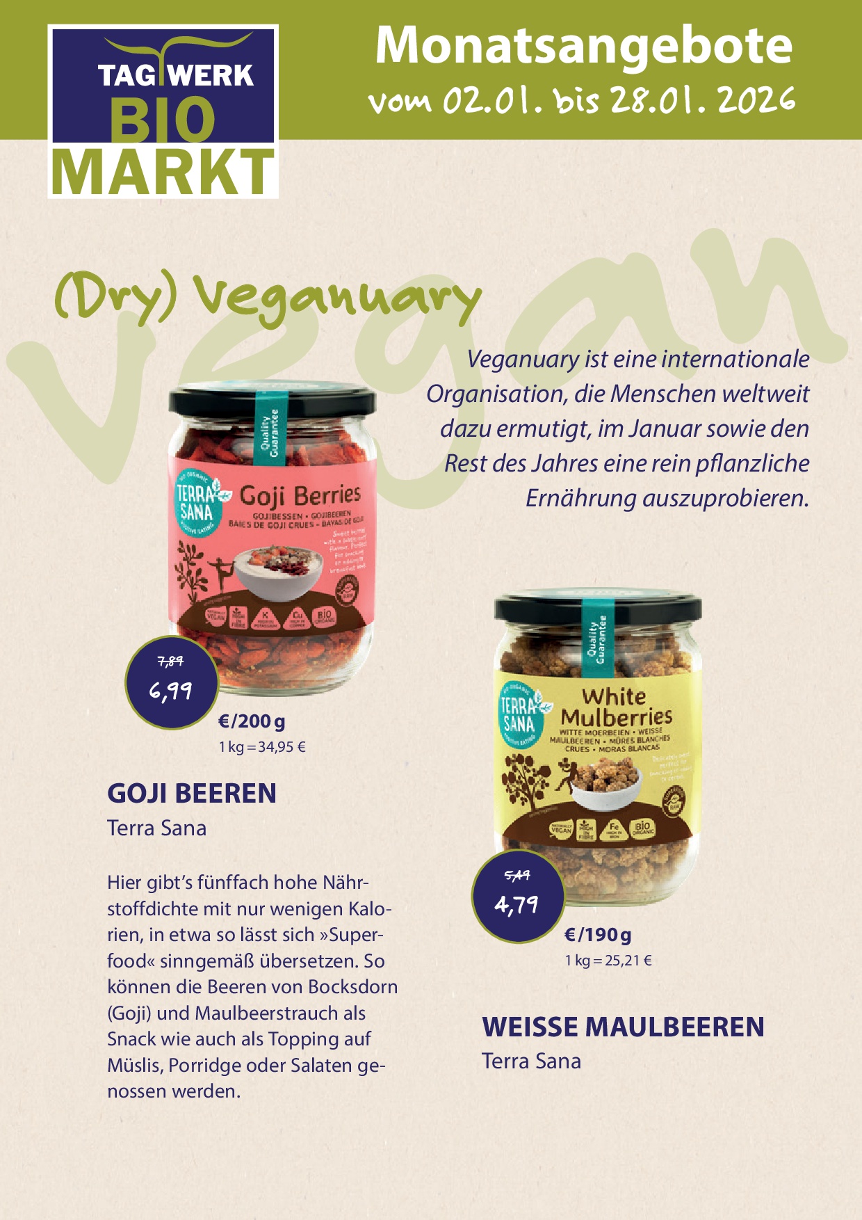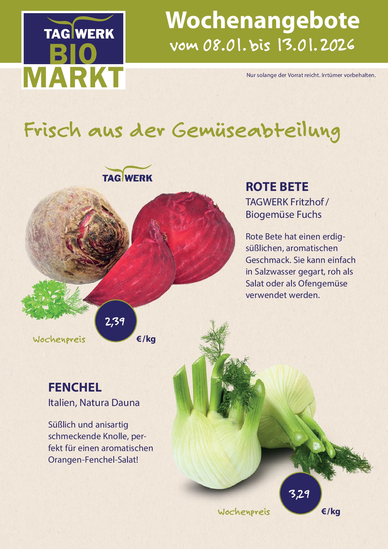 Waren die Feiertage etwas zu fleischlastig? Jetzt im "veganuary" haben wir ganz viele Fleischalternativen in Aktion. Zum Beispiel die Klassiker Falafel und Sterntaler von Soto. Auch die tollen Haferdrinks von Voelkel in der Glasflasche gibts zum Aktionspreis und vieles mehr. Aber man muss nicht unbedingt auf Fleisch und Wurst verzichten, wenn diese aus unserer eigenen TAGWERK Biometzgerei kommen. Hier gibt´s ausschließlich aus eigener Metzgerei-Schlachtung artgerecht gehaltene Biotiere aus der Region, handwerklich verarbeitet ohne Nitritpökelsalz und ohne Phosphate. Diese Woche in Aktion: Currywurst und unsere feine Delikatessstreichwurst. Und dazu natürlich wie immer das frische Gemüse der Woche, diesmal mit dem Winterklassiker Rote Bete.